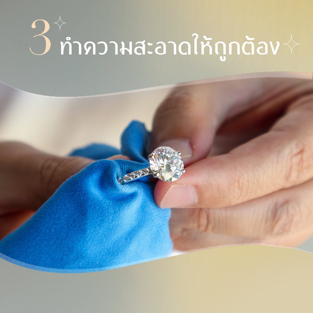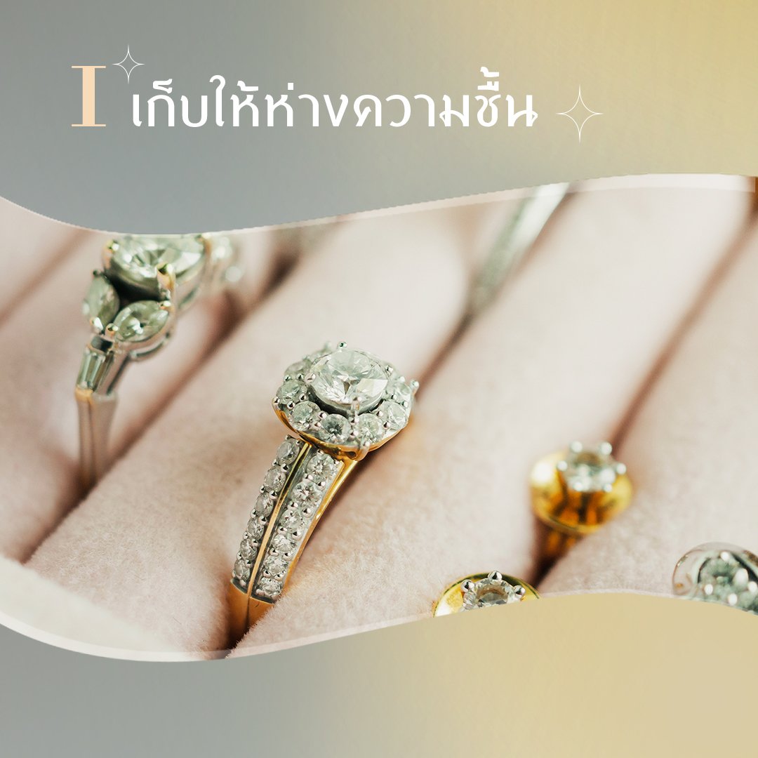 ความชื้นถือว่าเป็นศัตรูตัวร้ายของเครื่องประดับ โดยเฉพาะฝนที่มีทั้งฝุ่นละออง ความชื้น รวมถึงความมันจากผิวหนังของเรา เมื่อโดนฝนก็อาจทำให้เครื่องประดับเพชรของเราไม่เปล่งประกายได้ ดังนั้นถ้าหากต้องออกไปเจอฝนหรือความชื้น ควรถอดแหวนออกและเก็บให้มิดชิด แล้วค่อยใส่อีกครั้งเมื่อถึงที่หมายนะคะ - ดูแลตามประเภท