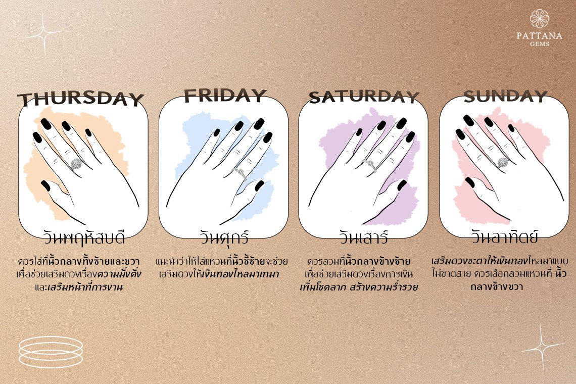 คนที่เกิดวันพฤหัสบดีนั้นเหมาะกับการใส่แหวนที่มีลักษณะใหญ่พอประมาณ ไม่เรียวหรือว่าหนาจนเกินไปค่ะ โดยการใส่แหวนเสริมดวงเรื่องเงินของคนเกิดวันนี้นั้นควรใส่ที่ นิ้วกลางทั้งซ้ายและขวา ค่ะ เพื่อช่วยเสริมดวงเรื่องความมั่งคั่ง และเสริมหน้าที่การงานให้เจริญรุ่งเรือง