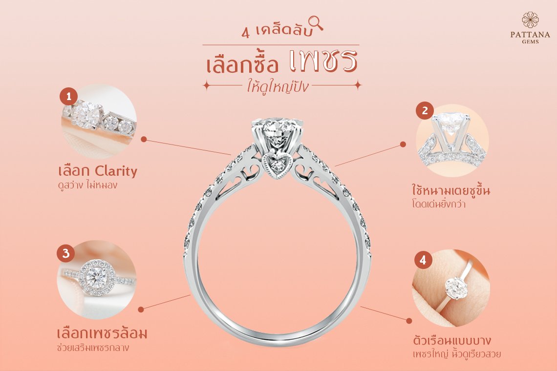 จากทั้ง 4 เคล็ดลับ จะเห็นได้ว่าเราสามารถเพิ่มขนาดของเพชรให้ดูใหญ่ขึ้นได้โดยไม่จำเป็นต้องเพิ่มงบประมาณเยอะ หรือเลือกเพชรกะรัตใหญ่เสมอไปนะคะ ซึ่งหากใครยังตัดสินใจไม่ได้ว่าจะเลือกซื้อแหวนเพชรยังไงให้ตอบโจทย์ความต้องการและคุ้มค่ากับงบประมาณที่ตั้งเอาไว้ ถ้าใครยังไม่รู้จะเลือกแบบแหวนยังไง ทักเข้ามาบอกความต้องการและงบประมาณในใจได้นะคะ ทาง Pattana Gems ช่วยดูให้อย่างละเอียดได้ค่ะ :) สามารถแวะเข้ามาปรึกษาเราได้ที่หน้าร้านเพชร Pattana Gems ดิโอลด์สยามพลาซ่า ชั้น 1 ห้อง E112 ได้เลยนะคะ เพราะเรามีเพชรเกรดคุณภาพ ราคาจากผู้ผลิต ให้คุณลูกค้าได้เลือกหลากหลายแบบ รับรองว่าได้แหวนเพชรที่ถูกใจในราคาที่สมเหตุสมผลอย่างแน่นอนค่ะ