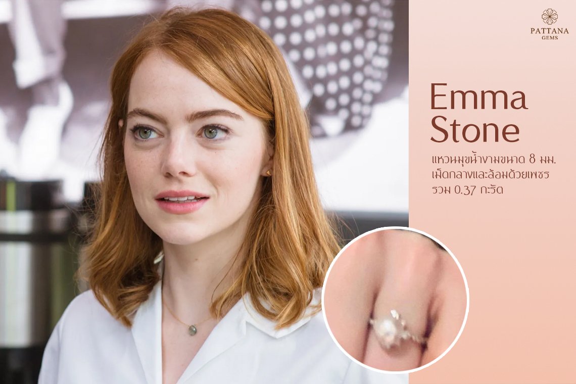 แม้จะไม่ได้ลงเอยกับพ่อหนุ่มซูเปอร์แมนตามที่แฟนๆ ลุ้นสุดใจ แต่ล่าสุดสาว Emma Stone ของเราก็ถูกแฟนหนุ่ม Dave McCary ขอแต่งงานแล้วนะคะ ซึ่งแหวนหมั้นของเธอนั้นเป็นเอกลักษณ์และไม่ซ้ำใครอย่างแน่นอนค่ะ เพราะเป็นแหวนที่ออกแบบโดย Yoshinobu Kataoka นักออกแบบเครื่องประดับชาวญี่ปุ่น โดยใช้มุขน้ำงามขนาด 8 มม. เป็นเม็ดกลางและล้อมด้วยเพชรรวม 0.37 กะรัต ซึ่งคาดการณ์กันว่าแหวนมีมูลค่าราว ๆ $4,780 เหรียญค่ะ