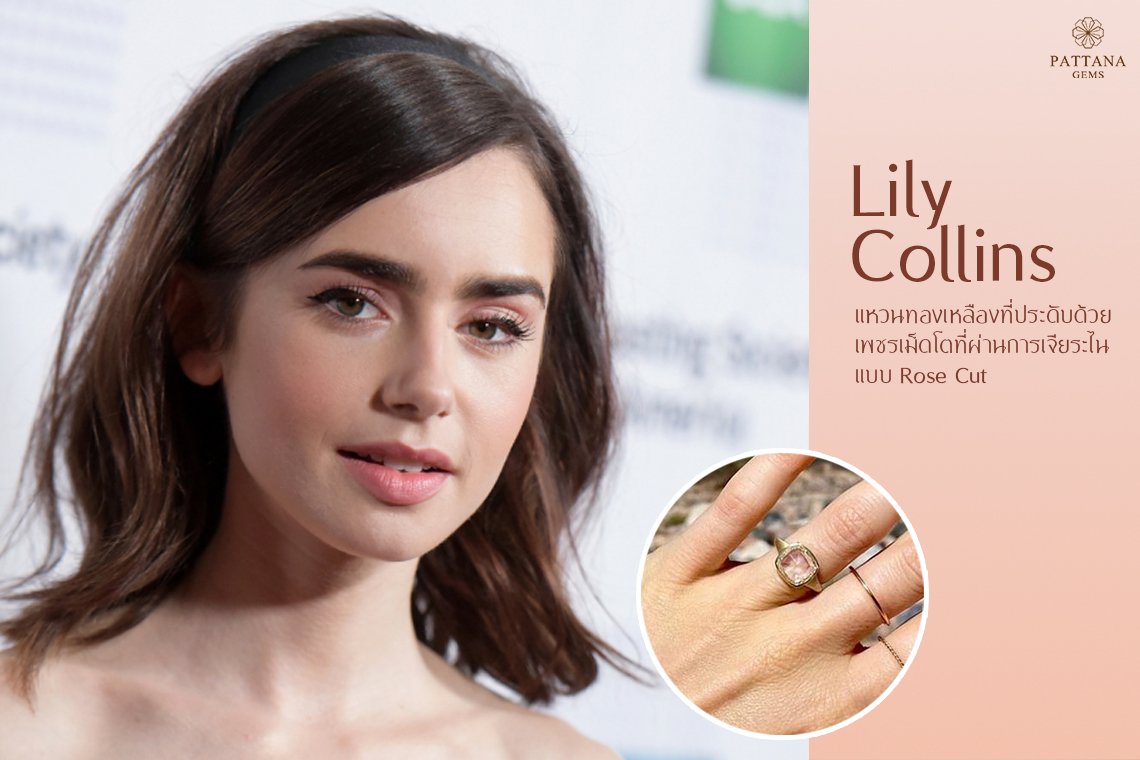 ต่อกันด้วยสาว Emily in Paris หรือสาวหน้าหวาน Lily Collins นั่นเองค่ะ ที่ใครได้เห็นแหวนหมั้นของเธอแล้วจะต้องร้องว้าว เพราะเป็นแหวนที่มีดีไซน์แบบยูนีคสุด ๆ โดยเป็นแหวนทองเหลืองที่ประดับด้วยเพชรเม็ดโตที่ผ่านการเจียระไนแบบ Rose Cut หรือเพชรเหลี่ยมกุหลาบที่ถือเป็นเหลี่ยมเพชรแบบเก่าแก่ มีมาตั้งแต่สมัยปี ค.ศ. 1520 เรียกได้ว่าเป็นแหวนหมั้นที่ให้กลิ่นอายความวินเทจสุดๆ ซึ่งมีการคาดการณ์ว่าอาจมีมูลค่าสูงถึง $100,000 เหรียญเลยค่ะ