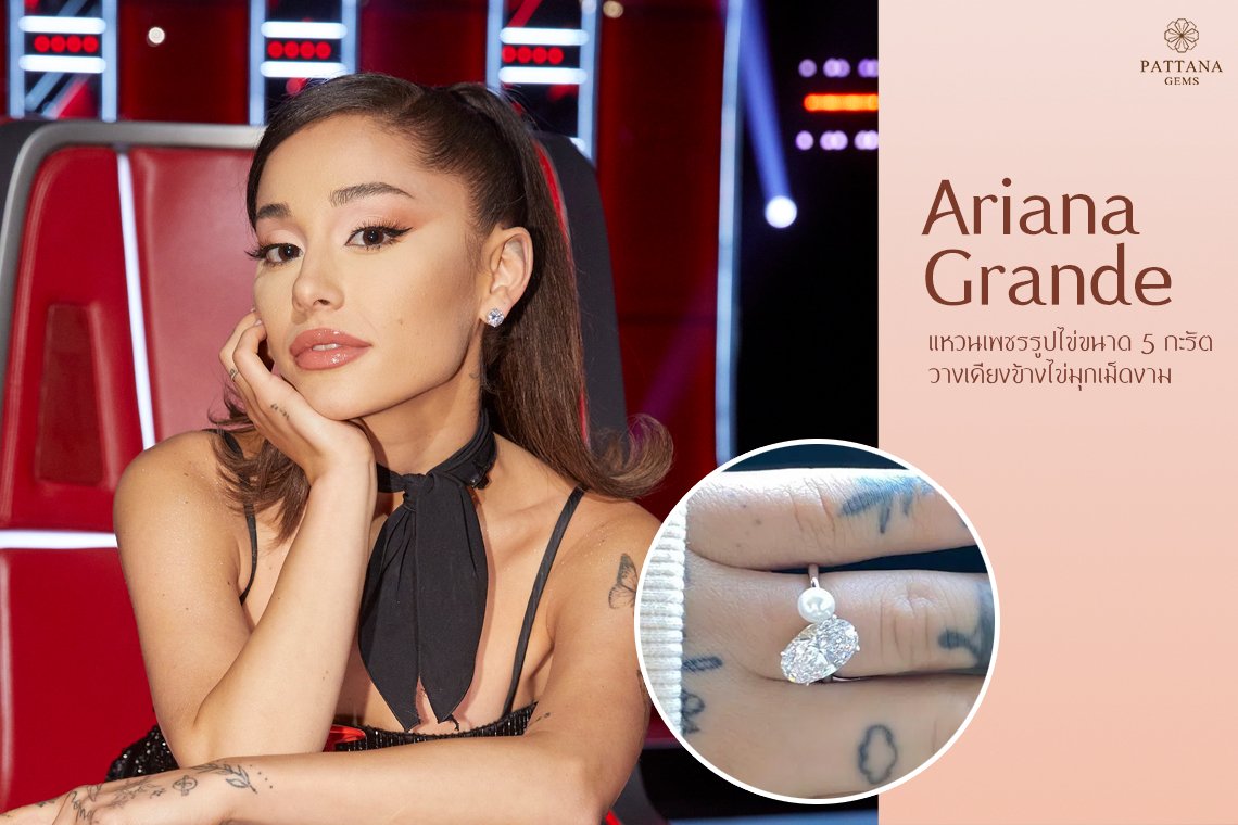 เริ่มต้นด้วยนักร้องสาวไซส์มินิที่มาพร้อมกับเสียงอันทรงพลังอย่าง Ariana Grande ที่เพิ่งเข้าพิธีวิวาห์กับแฟนหนุ่ม Dalton Gomez ไปเมื่อปีที่แล้ว งานนี้นอกจากแฟนเพลงจะรู้สึกยินดีกับสาวอาริแล้ว ยังต้องรู้สึกอิจฉาไปตามๆ กัน เพราะแหวนหมั้นของเธอนั้นดูเด่นเป็นสง่าสุดๆ โดยเป็นแหวนเพชรสั่งทำรูปไข่ขนาด 5 กะรัต วางเคียงข้างไข่มุกเม็ดงาม ทำให้แหวนวงนี้มีเอกลักษณ์ไม่เหมือนใคร เหมาะกับจริตของอาริสุดๆ ซึ่งงานนี้มีการประเมินกันว่าราคาแหวนอาจมีมูลค่าสูงถึง $200,000 - $250,000 เหรียญเลยทีเดียวค่ะ