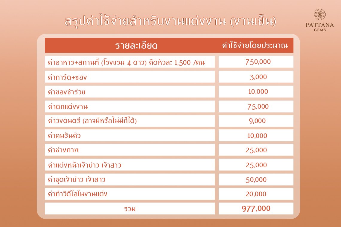 สรุปรวมๆ แล้ว ค่าใช้จ่ายสำหรับการจัดงานแต่งงานตอนเย็นที่มีแขกจำนวน 500 ท่าน ในโรงแรมระดับ 4 ดาว อาจสูงถึง 977,000 บาท เลยนะคะ ซึ่งรายละเอียดต่างๆ เป็นค่าใช้จ่ายคร่าวๆ ที่เรารวบรวมมาจะช่วยให้คู่บ่าวสาวมองเห็นภาพรวมของงบประมาณที่ควรต้องเตรียมไว้ได้ชัดเจนมากขึ้น โดยคู่บ่าวสาวสามารถลดหรือเพิ่มจำนวนแขกได้อย่างอิสระ รวมถึงวางแผนรูปแบบของการจัดงานที่ต้องการก็จะช่วยให้สามารถคุมงบไม่ให้บานปลายได้ค่ะ