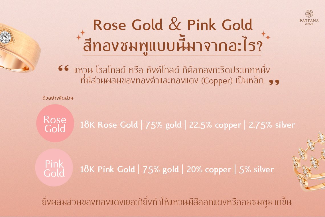 ในวงการเครื่องประดับนอกจากตัวเรือนแหวนที่ทำจากทองคำและทองคำขาวแล้ว แหวนทองสีชมพูหรือที่เรียกกันว่า Rose Gold และ Pink Gold ยังได้รับความนิยมอย่างมากด้วยนะคะเนื่องจากมีความสวยงาม มีสีสันสดใสดูหวานละมุน ซึ่งหลายคนอาจจะสงสัยกันว่าตัวเรือนแหวนสีทองชมพูนี้มันคือทองหรือเปล่า? แล้วทำจากอะไรกันแน่? วันนี้ Pattana Gems จะมาคลายข้อสงสัยให้ทุกคนได้รู้กันค่ะ