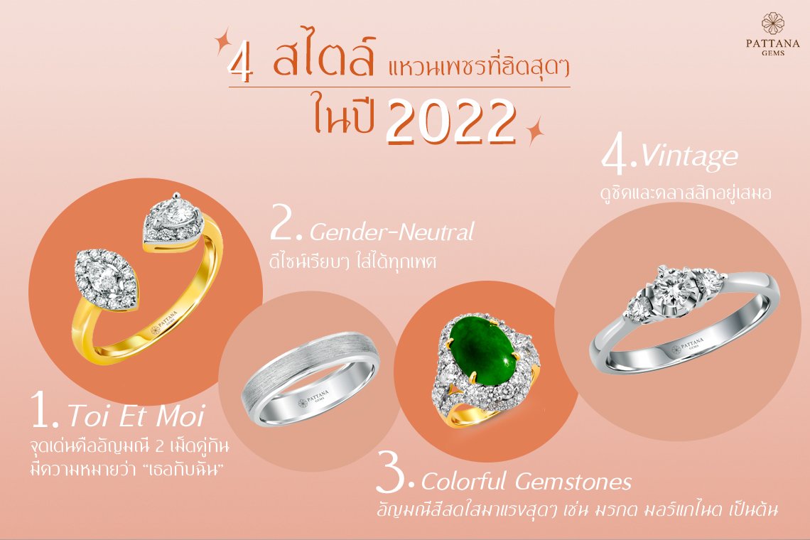 นอกจากแหวนเพชรเม็ดเดียวสุดคลาสสิคที่ได้รับความนิยมมาตลอดกาลแล้ว ในส่วนของปี 2022 นี้ก็มีแหวนเพชรรูปแบบอื่นๆ ที่กำลังมาแรงไม่แพ้กันเลยนะคะ ยิ่งถ้าเลือกเป็นแหวนหมั้นยังดูมีสไตล์แบบไม่ซ้ำใครด้วย ส่วนแหวนเพชรที่กำลังอินเทรนด์และมาแรงในหมู่เซเลบในปีนี้จะมีแบบไหนบ้างนั้น ตามมาดูพร้อมกันเลยค่า