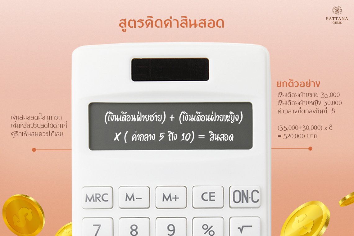 (เงินเดือนฝ่ายชาย) + (เงินเดือนฝ่ายหญิง) X ( ค่ากลาง 5 ถึง 10) = สินสอด