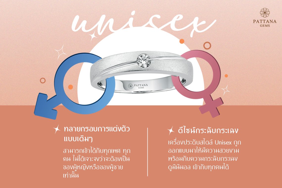 สำหรับเครื่องประดับสไตล์ Unisex ไม่ว่าจะเป็นนาฬิกา สร้อยคอ สร้อยข้อมือ หรือ แหวน มักจะถูกออกแบบมาให้มีความสวยงามพร้อมกับความกระฉับกระเฉง ที่สำคัญคือเน้นความเรียบง่าย และมีกลิ่นอายของความมินิมอล โดยสามารถ Mix and Match กับเสื้อผ้าดีไซน์ต่างๆ ได้ง่าย โดยอาจมีรูปทรงเรขาคณิตที่สะท้อนความแข็งแกร่ง หรือมีลูกเล่นประดับด้วยอัญมณีเพื่อให้ความรู้สึกแบบ Feminine หน่อยๆ