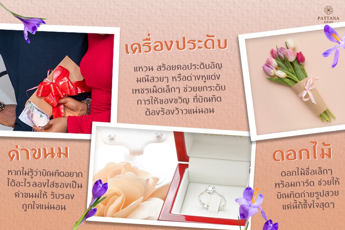 ควรเลือกเป็นดอกไม้ช่อเล็กๆ เบาๆ เช่น ช่อดอกทานตะวันหรือดอกทิวลิปสีสันสดใสจะน่ารักมากๆ ค่ะ หรือหากใครที่อยากเขียนการ์ดแสดงความในใจด้วย ก็สามารถเลือกทำการ์ดดอกไม้แห้งที่มีความเรียบง่าย แต่อัดแน่นไปด้วยคำยินดีไว้ด้านในก็ได้นะคะ รับรองว่าบัณฑิตซึ้งใจอย่างแน่นอน แถมยังเก็บไว้ได้นานด้วยค่ะ