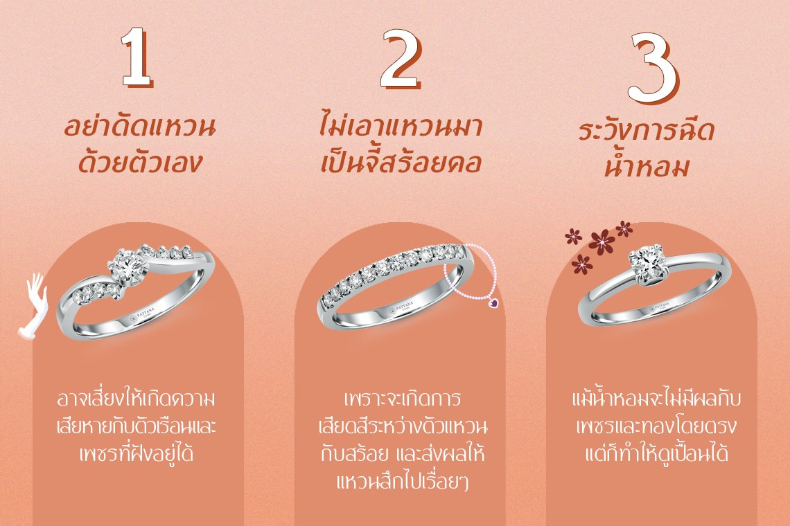 นอกจากสิ่งที่ควรรู้ทั้ง 3 ข้อที่เรานำมาฝากกันในวันนี้แล้ว สาวๆ อย่าลืมคำนึงถึง หลัก 5S ที่ต้องหลีกเลี่ยง เพื่อให้เครื่องประดับของเราคงความสวยปิ๊งไปนานๆ ด้วยนะคะ และสำหรับใครที่กำลังมองหาแหวนหมั้น แหวนแต่งงาน หรือแหวนสำหรับใส่ในชีวิตประจำวันสวยๆ คุณภาพดี ราคาสมเหตุสมผล สามารถแวะมาหาเราได้ที่ Pattana Gems ชั้น 1 ดิโอลด์สยามพลาซ่า ห้อง E112 ได้เลยนะคะ เราพร้อมส่งมอบสินค้าคุณภาพและบริการด้วยความจริงใจให้แก่คุณลูกค้าของเราทุกคนอย่างแน่นอนค่ะ
