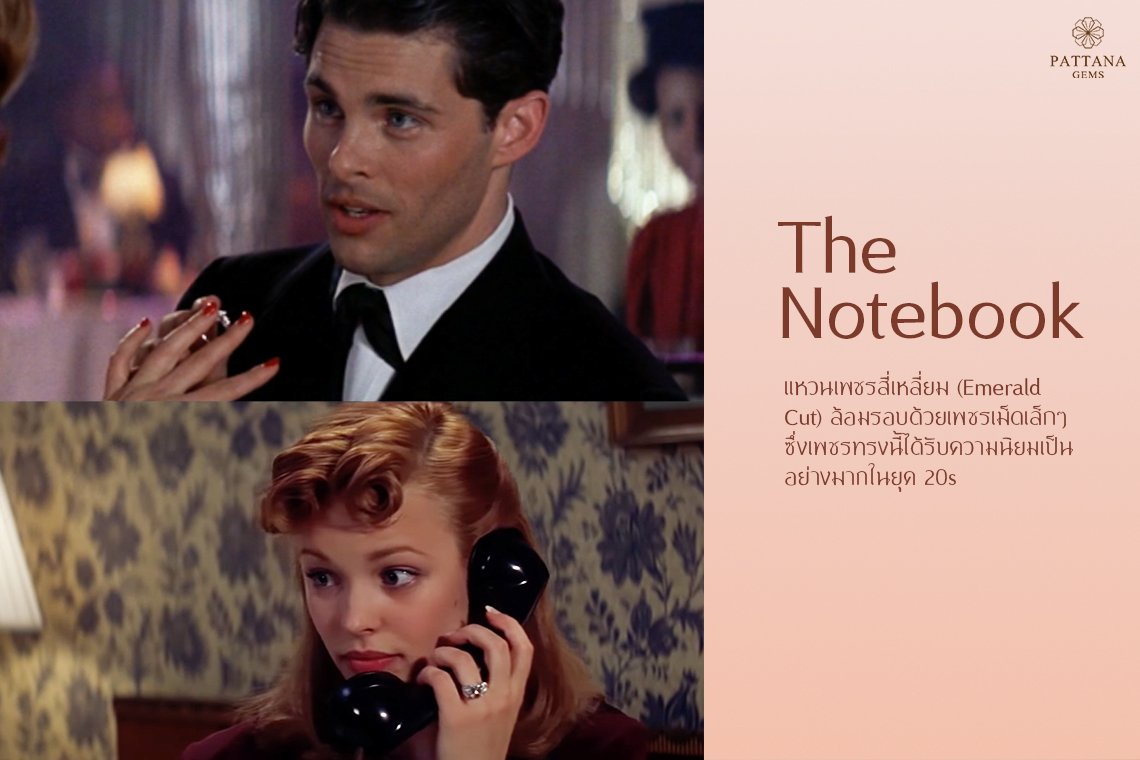 แหวนหมั้นอีกหนึ่งทรงที่น่าสนใจมากๆ วงนี้มาจากภาพยนตร์เรื่อง The Notebook นั่นเองค่ะ ซึ่งแหวนที่อยู่ในฉากที่แอลลี่โดนแฟนหนุ่มขอแต่งงานนั้นเป็นแหวนเพชรสี่เหลี่ยม (Emerald Cut) ล้อมรอบด้วยเพชรเม็ดเล็กๆ ซึ่งเพชรทรงนี้ได้รับความนิมยมมากๆ ในยุค 20s แต่ถ้าหากเอามาใส่ตอนนี้ก็ดูเก๋ไม่ซ้ำใครดีนะคะ