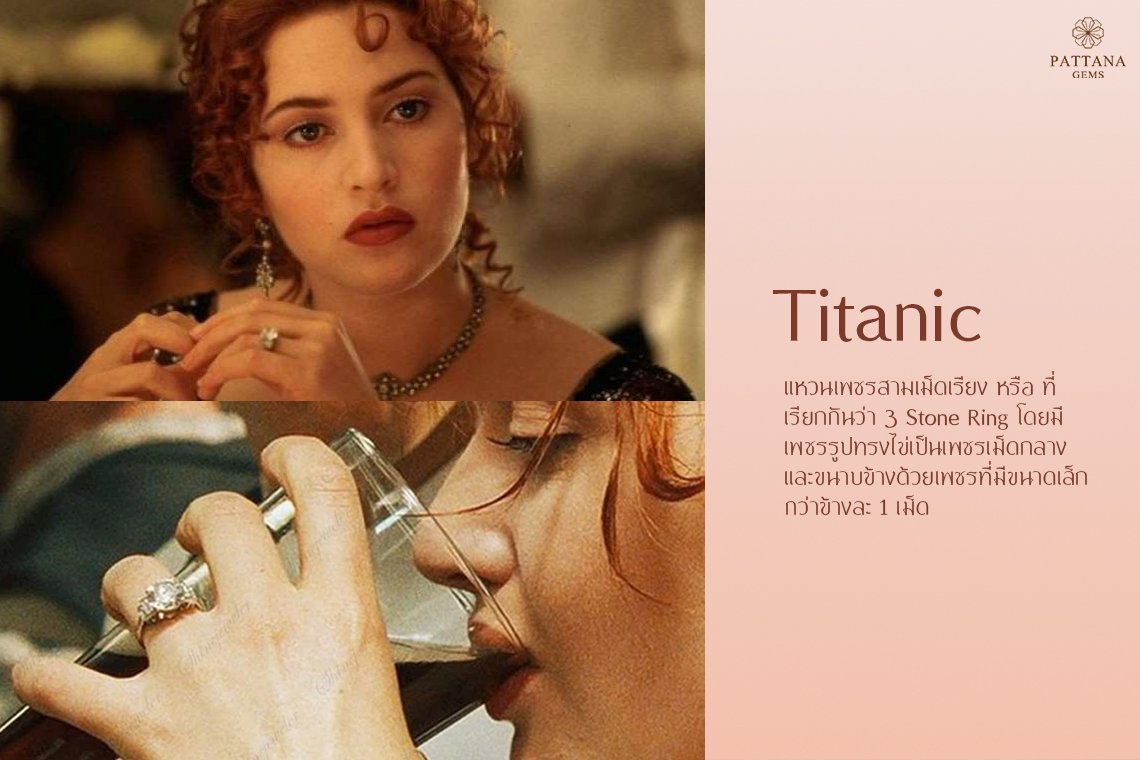 นอกจากสร้อยคอจี้หัวใจสีน้ำเงินที่หลายๆ คนน่าจะจำได้แล้ว หากสังเกตดีๆ แหวนเพชรที่โรสสวมใส่อยู่ก็ดูแพงและเลอค่าไม่แพ้กันนะคะ โดยดีไซน์ของแหวนมีความก้ำกึ่งกันของยุคเอ็ดเวิร์ดตอนปลายและอาร์ตเดโคตอนต้น และในส่วนของเพชรก็งดงามมากๆ เพราะเป็นแหวนเพชรสามเม็ดเรียง หรือ ที่เรียกกันว่า 3 Stone Ring โดยมีเพชรรูปทรงไข่เป็นเพชรเม็ดกลาง และขนาบข้างด้วยเพชรที่มีขนาดเล็กกว่าข้างละ 1 เม็ด หากใครที่ชอบความหรูหรา ความเว่อร์วังต้องจัดแหวนเพชรสไตล์นี้เลยค่ะ