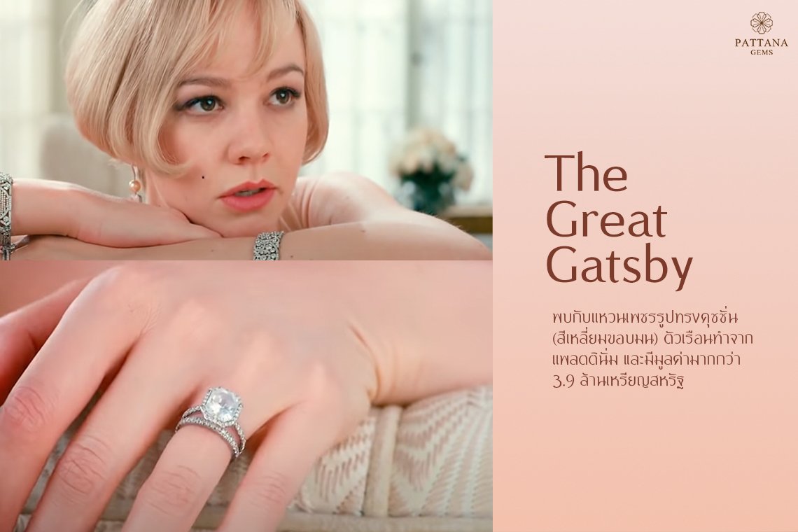 แม้ในหนังเราจะไม่ได้เห็นฉากที่นางเอกโดนขอแต่งงาน แต่ฉากที่เดย์ซี่โผล่หน้าขึ้นมาจากโซฟาก็ทำให้หลายๆ คนตะลึงกับความสวยของเธอและความงามของแหวนเพชรเม็ดโตไปตามๆ กันค่ะ โดยแหวนที่ตัวละครในเรื่องใส่นั้นเป็นแหวนเพชรรูปทรงเรขาคณิต ตัวเรือนเป็นแพลตตินั่ม ผลิตโดย Tiffany & Co. และมีมูลค่ามากกว่า 3.9 ล้านเหรียญสหรัฐ เรียกได้ว่าเป็นแหวนที่ไม่มีวันตกรุ่นอย่างแน่นอนค่ะ เพราะดูชิคมากๆ