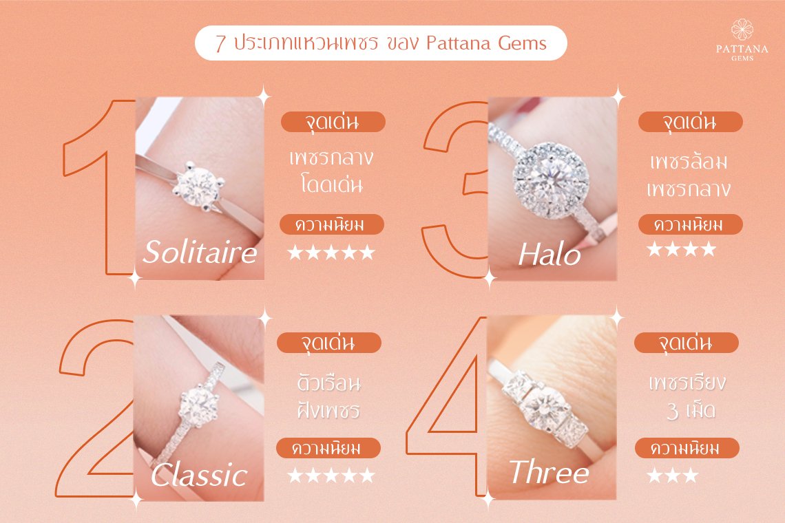 เข้าสู่ช่วงฤดูกาลจัดงานแต่งงานกันอีกแล้วนะคะ ปฏิเสธไม่ได้เลยพอใกล้ถึงช่วงปลายปีหรือต้นปีทีไรเรามักจะได้ยินข่าวดีของเพื่อนสนิท ญาติพี่น้อง หรือคนใกล้ตัวประกาศสละโสดและจับมือเข้าสู่ประตูวิวาห์กันอย่างไม่ขาดสาย และแน่นอนว่าหนึ่งในสัญลักษณ์ของงานแต่งงานที่แทนความรักของว่าที่เจ้าบ่าวเจ้าสาวคงหนีไม่พ้น “แหวนแต่งงาน” นั่นเองค่ะ ซึ่งหากคุณผู้อ่านเองก็กำลังมีแผนจะเซอร์ไพรส์คนรู้ใจหรือวางแพลนจะจัดงานแต่งงานเร็วๆ นี้ และกำลังมองหาแหวนเพชรอยู่ วันนี้ Pattana Gems มีแหวนเพชร 7 ประเภทของทางร้านมาแนะนำเผื่อเป็นตัวเลือกแทนสัญญารักของคนทั้งสองค่ะ