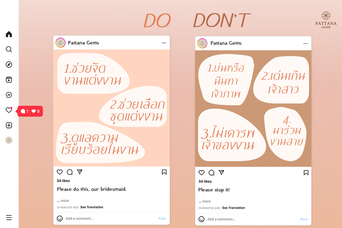 X ไม่ควรใส่ความคิดเห็นของตัวเองมากเกินไป แม้ว่าเจ้าสาวอาจจะขอความช่วยเหลือเรื่องการจัดเตรียมงานแต่งงาน แต่สุดท้ายแล้วงานแต่งงานนี้เป็นวันที่สำคัญที่สุดในชีวิตของเจ้าสาว ดังนั้น หากเสนออะไรไปแล้วเจ้าสาวไม่ชอบก็ควรรับฟังความคิดเห็นของเจ้าสาวค่ะ