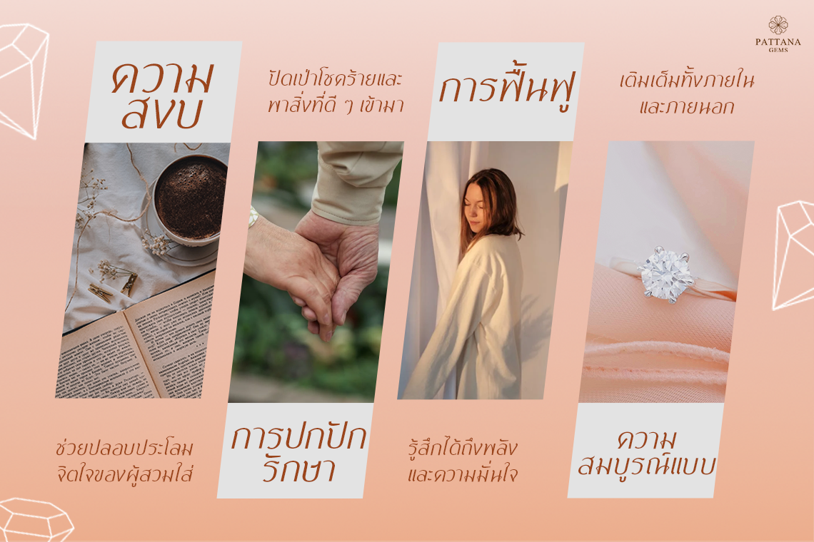 ก่อนที่เพชรจะถูกกล่าวถึงในแง่ของความงดงาม อัญมณีชนิดนี้ถูกกล่าวขานในนามของความสงบมาก่อน ด้วยคุณสมบัติเฉพาะตัวของเพชรที่ผู้คนเชื่อว่ามีความสามารถในการปลอยประโลมจิตใจ ทำให้เราผ่อนคลายและสงบ ซึ่งจุดนี้เองก็ถูกนำมาผูกกับความเชื่อสมัยใหม่อย่างความรักและความมั่นคงเป็นนิรันด์ เพราะความรักที่มั่นคงก็เปรียบเหมือนความรู้สึกที่สงบ เต็มไปด้วยสันติ ไร้ซึ่งความแตกแยกนั่นเองค่ะ