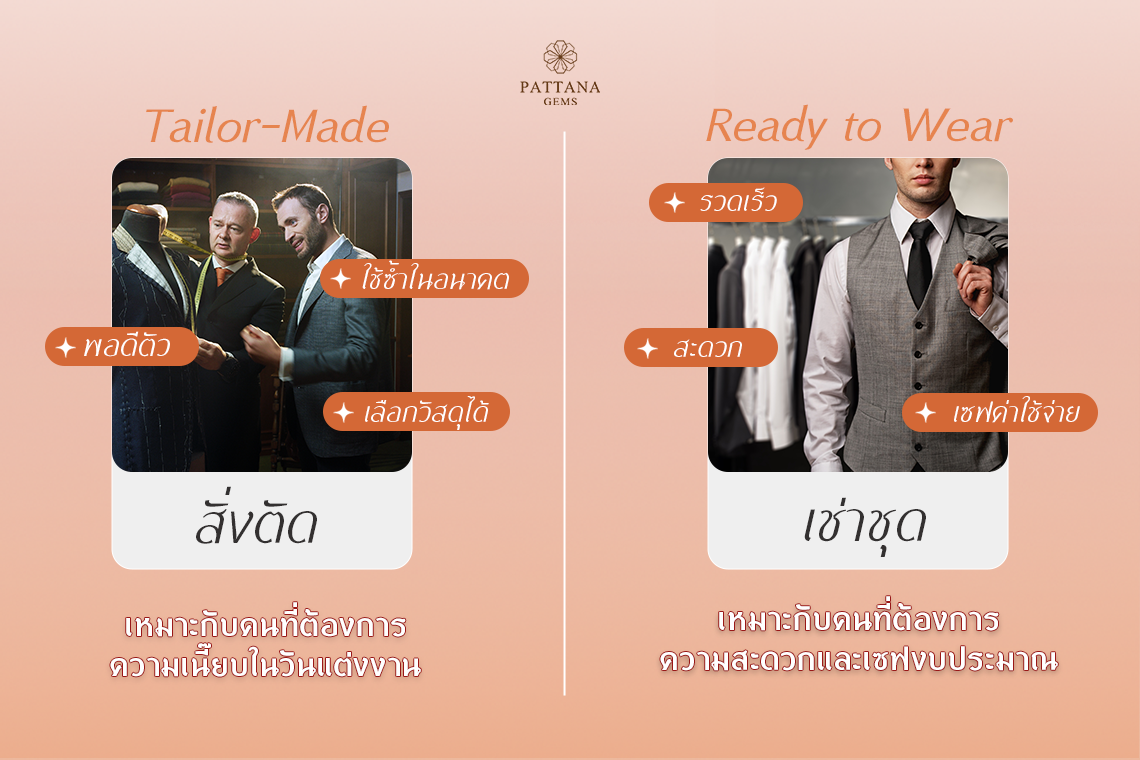 หนุ่มๆ หรือสาวๆ ที่กำลังมีแพลนแต่งงาน แล้วกำลังอยู่ในขั้นตอนเลือกชุด วันนี้ Pattana Gems มีบทความที่จะมาเป็นความรู้สำหรับการเลือกสูทเจ้าบ่าวมาฝากกันค่า เพราะชุดแต่งงาน ไม่ว่าจะของเจ้าบ่าวหรือเจ้าสาวต่างก็มีค่าใช้จ่ายใช่มั้ยละคะ เพื่อให้การลงทุนของคู่บ่าวสาวคุ้มค่าที่สุด เรามาดูกันเลยว่าสูทสำหรับเจ้าบ่าวควรสั่งตัดดี หรือว่าควรเช่าก็เพียงพอแล้ว